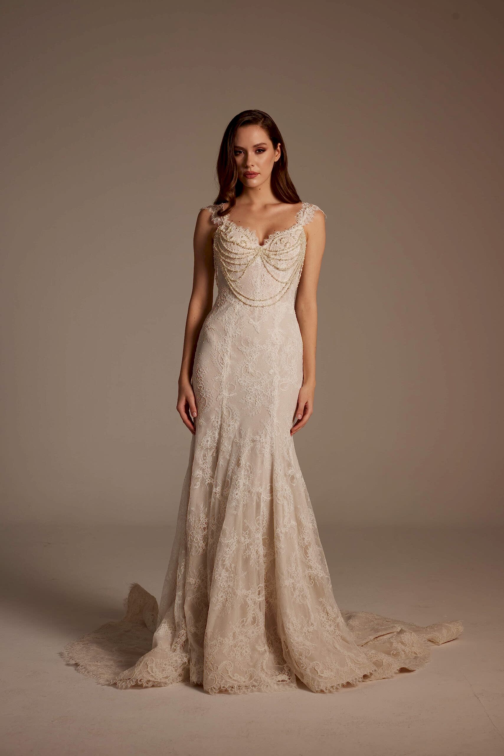 Straplez formda tasarlanan üst beden, göğüs hattında kullanılan ince dantel detaylarıyla romantik bir etki yaratıyor. Belden aşağı doğru vücudu saran balık kesim, diz hizasından itibaren yumuşak bir şekilde açılarak akıcı ve dengeli bir duruş sağlıyor. Tüm gelinlik boyunca devam eden zarif dantel işlemeler, ışıkla birlikte göz alıcı bir görünüm sunuyor.