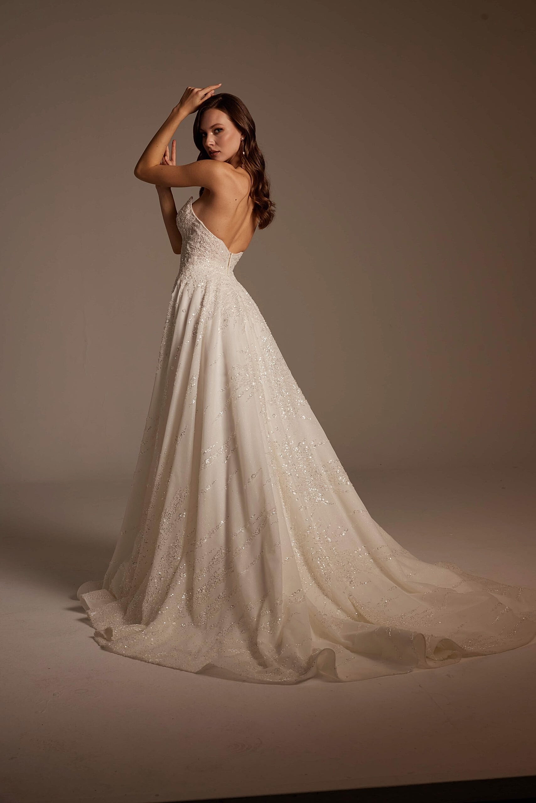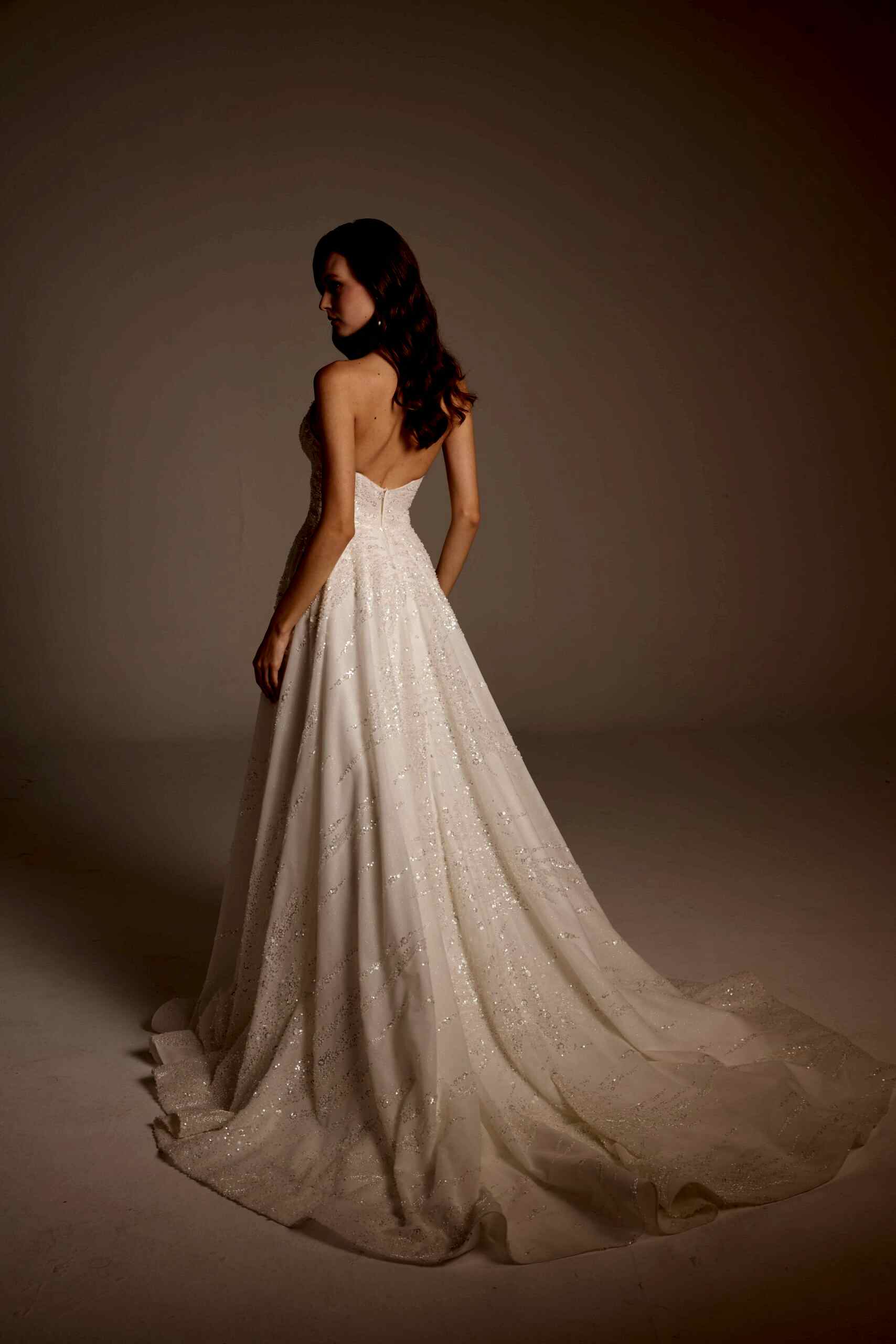 Arka tasarımda sade ve açık sırt formu tercih edilmiştir. Bu detay, gelinliğin ışıltılı ön yüzünü dengelerken modern bir şıklık yaratır. Uzun ve akışkan eteği, yürüyüş sırasında doğal bir hareket sağlayarak sahnede etkileyici bir görünüm sunar.