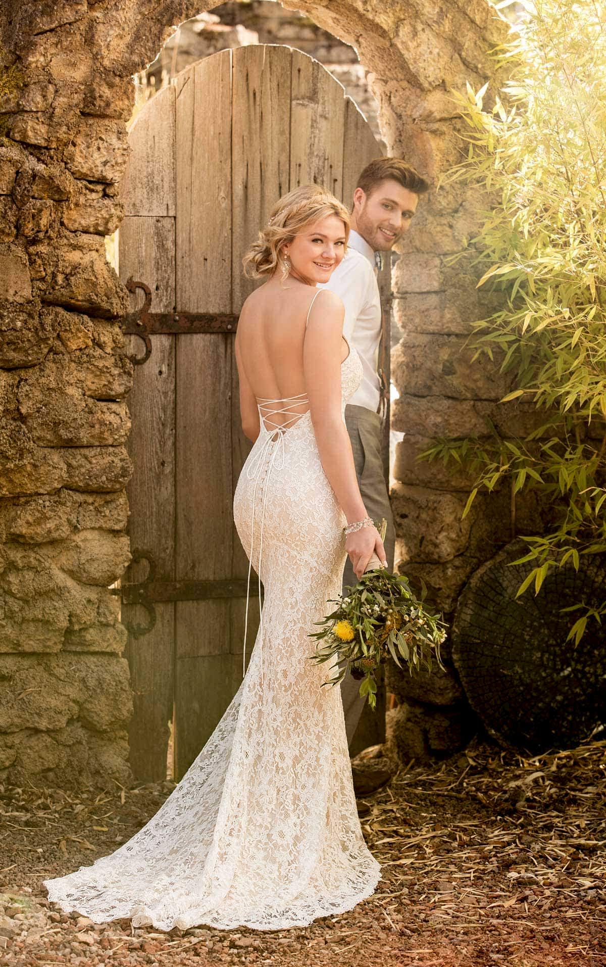 Göz alıcı detaylara, romantik kesimlere sahip, botanik dantel desenli gelinlik modeli….