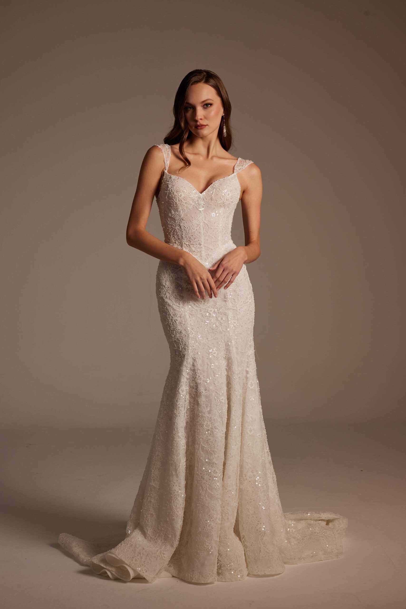 Zarif detayları ve feminen siluetiyle öne çıkan Lola Model, Nurcan Ege 2026 Gelinlik Koleksiyonu’nun modern ve zamansız tasarımlarından biridir. İnce askılı dantel işlemeli üst bedeni, vücuda kusursuz bir şekilde oturarak doğal bir şıklık sunar.