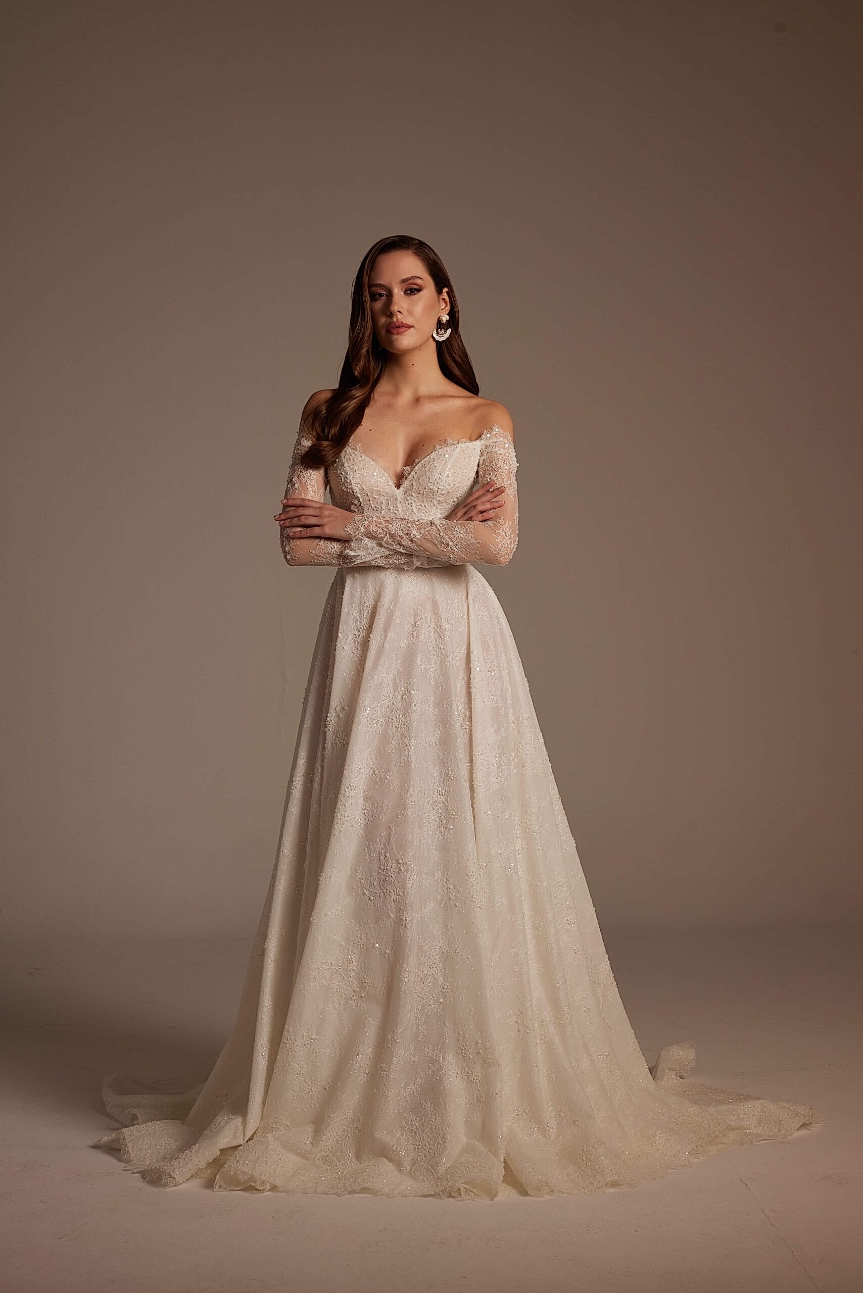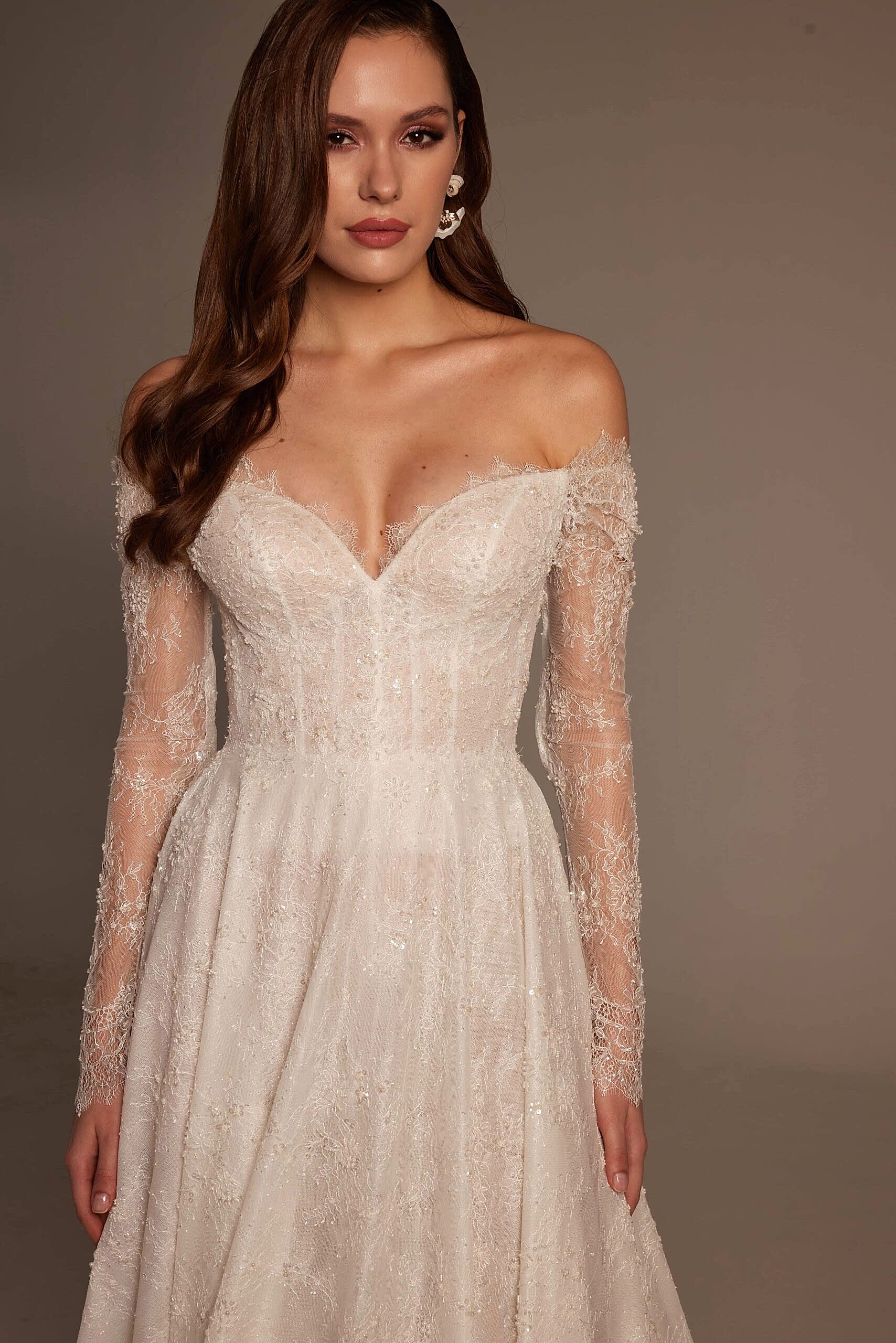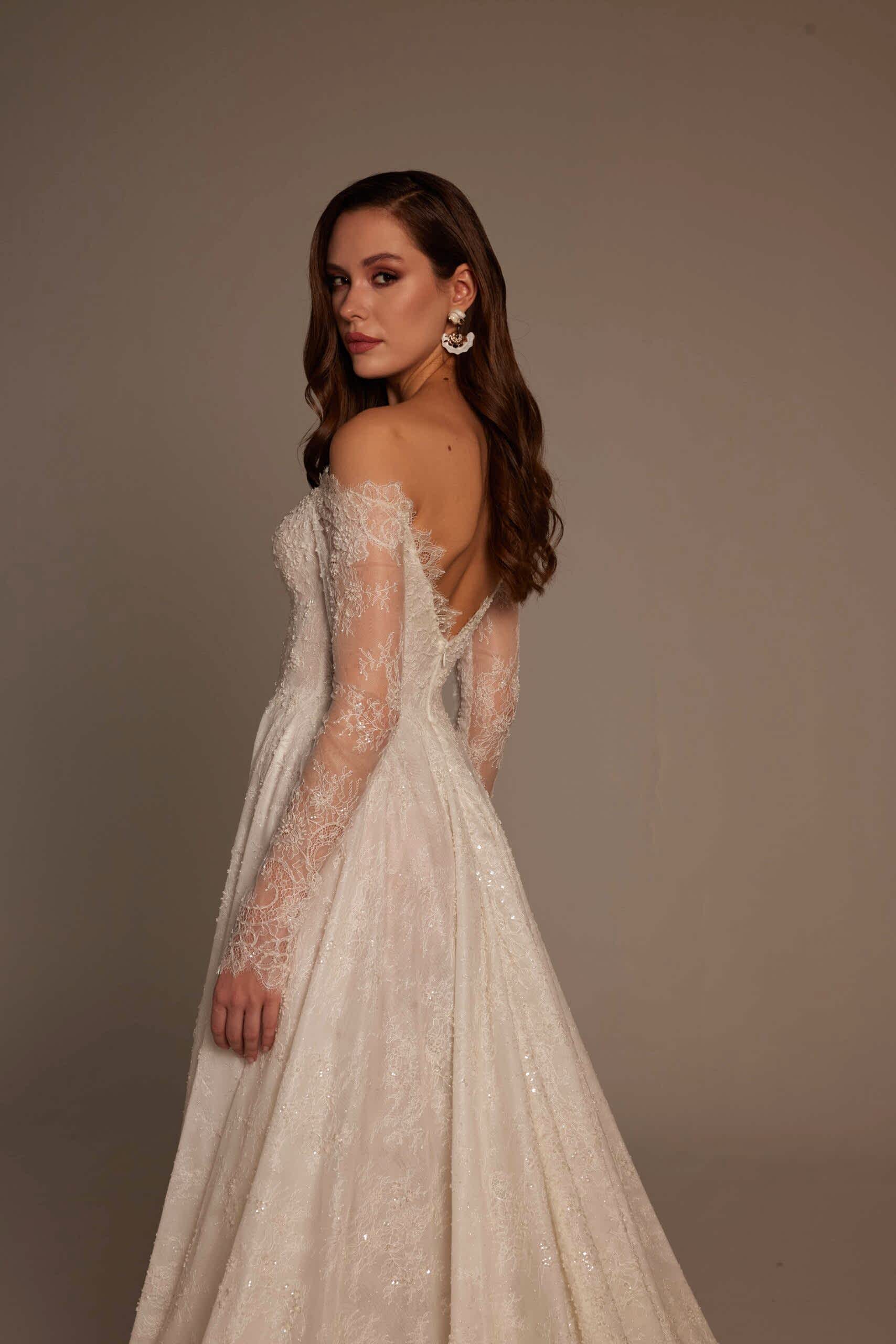 Merve Model, Nurcan Ege 2026 Gelinlik Koleksiyonu’nun romantik zarafeti sofistike detaylarla buluşturan özel tasarımlarından biridir. Omuzdan düşen transparan dantel kollar, gelinliğe yumuşak ve feminen bir ifade kazandırırken; derin V yaka formu dekolte hattını zarif ve dengeli bir şekilde öne çıkarır.