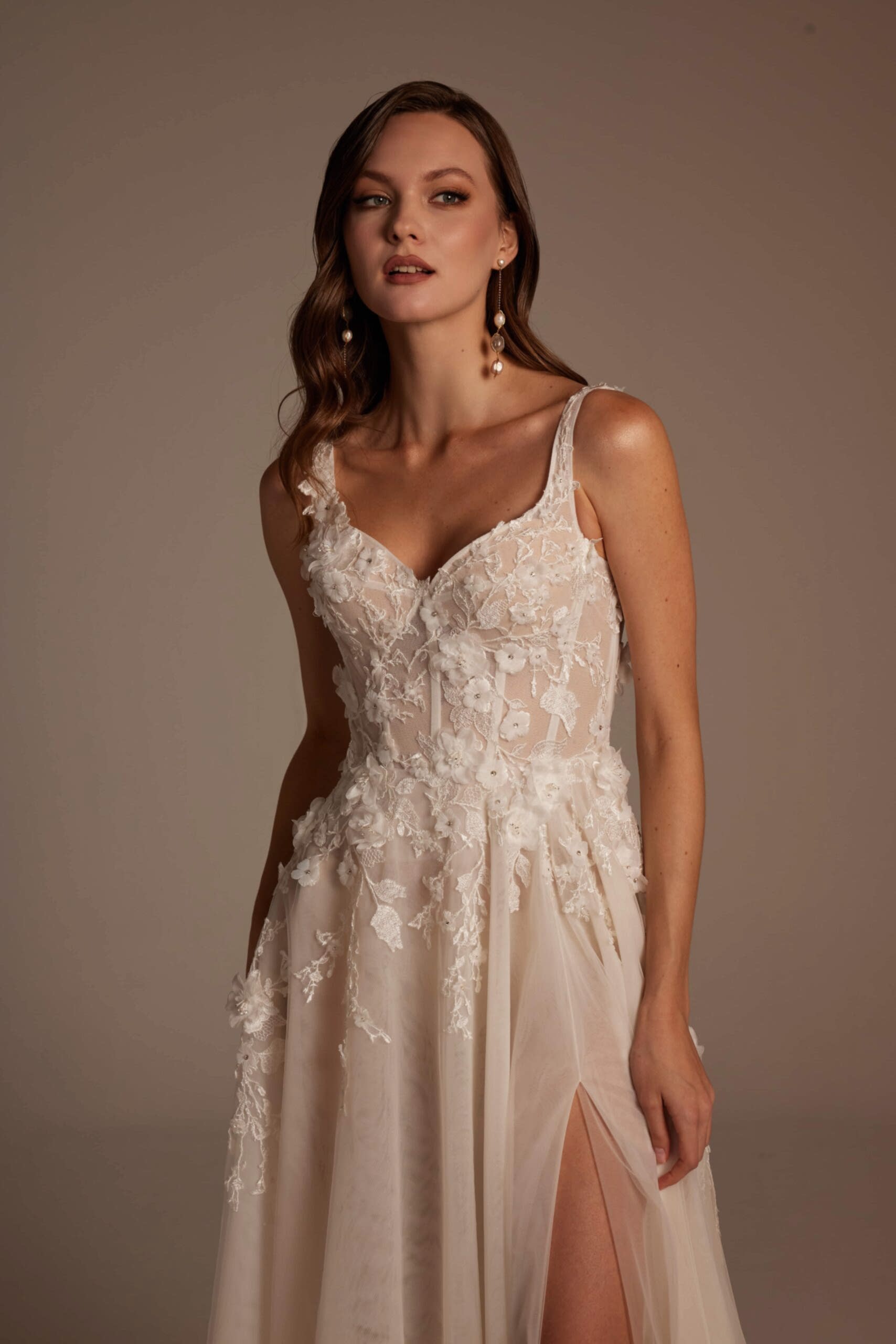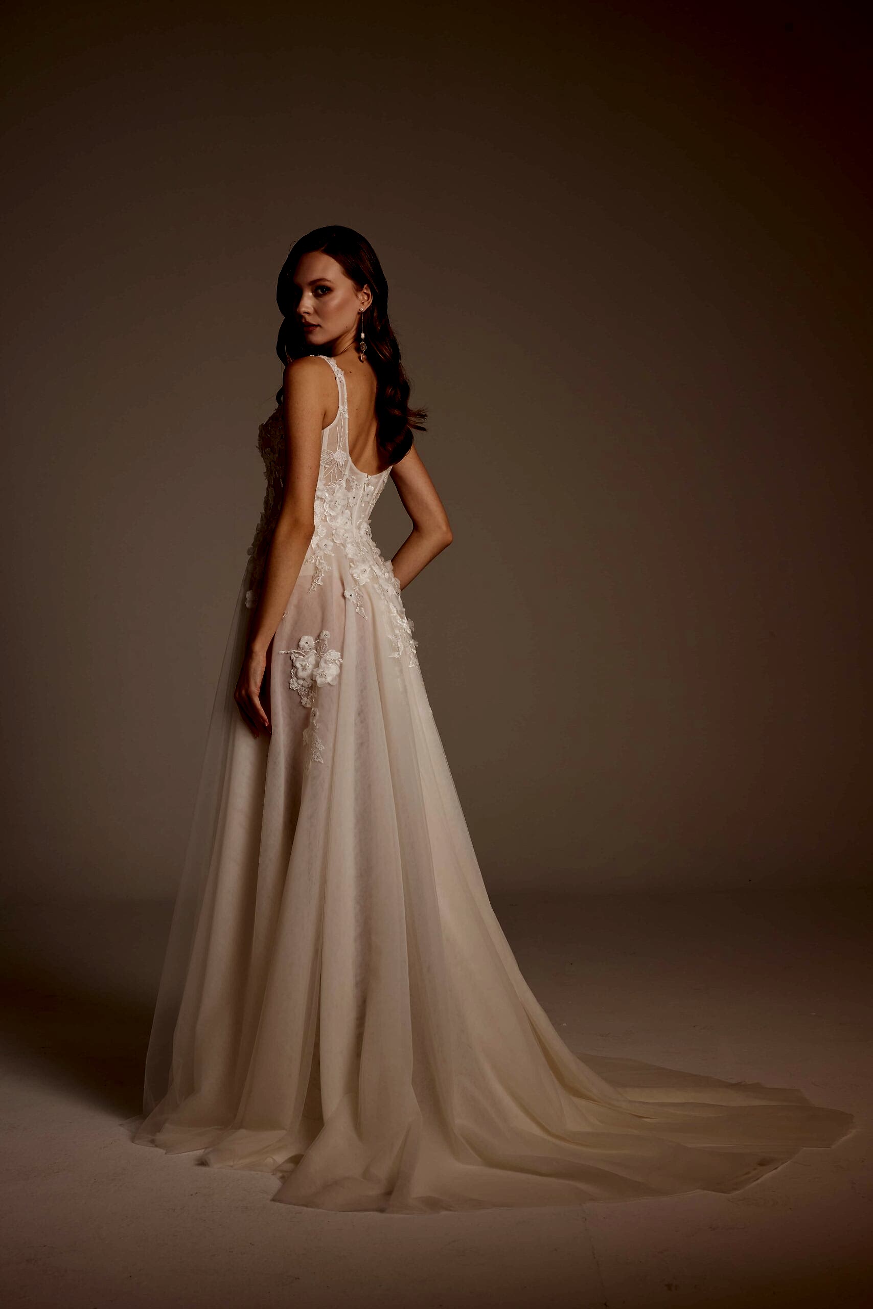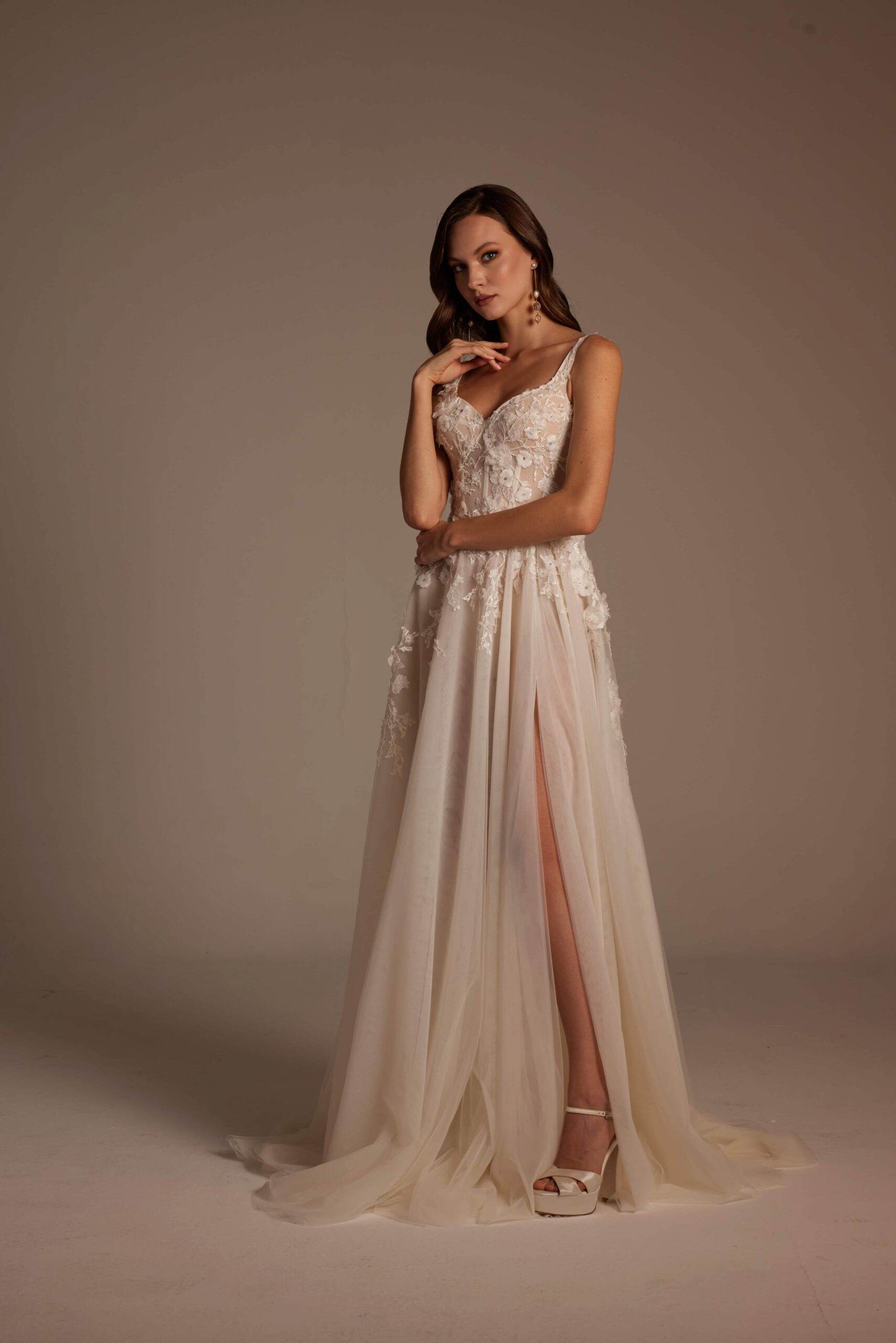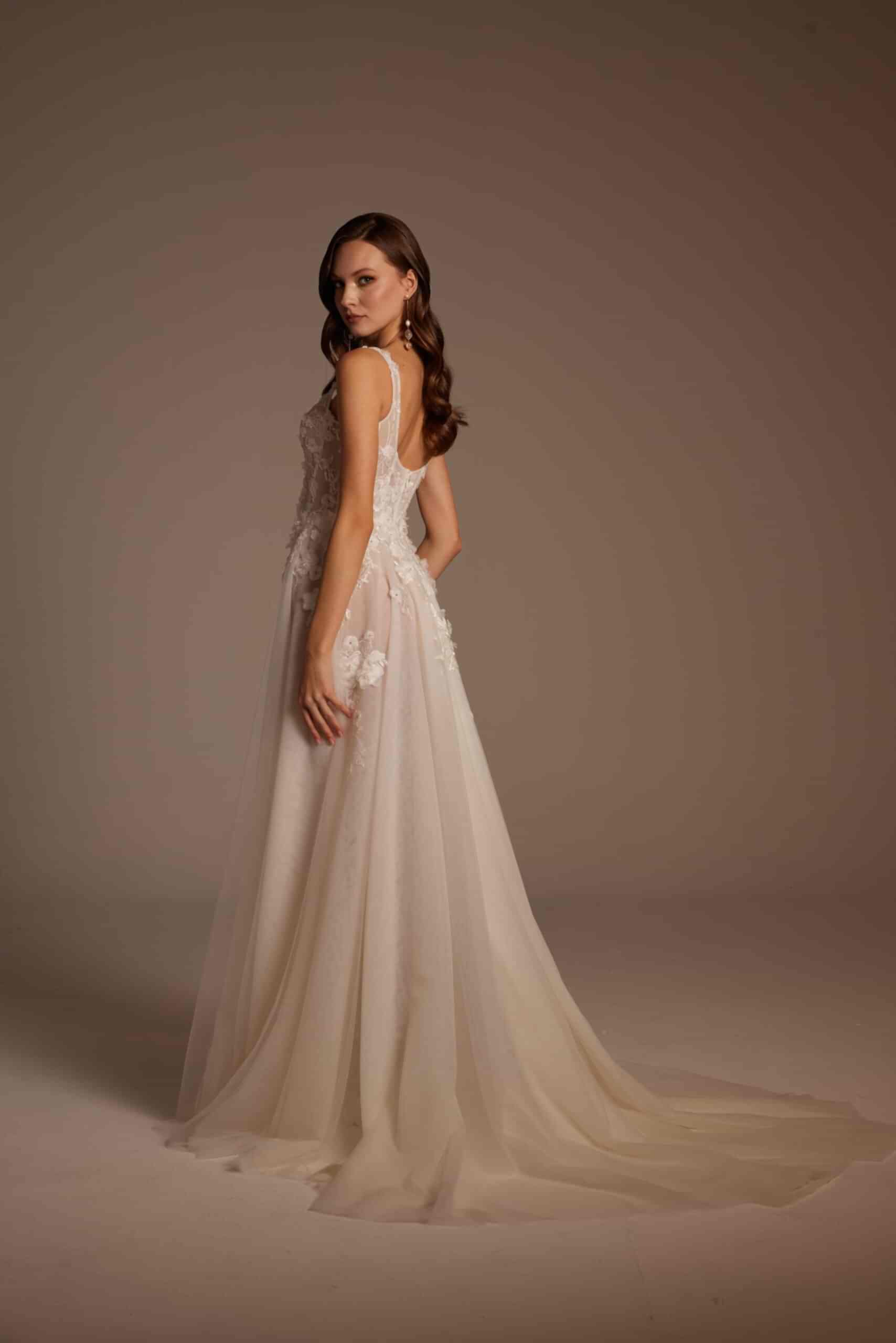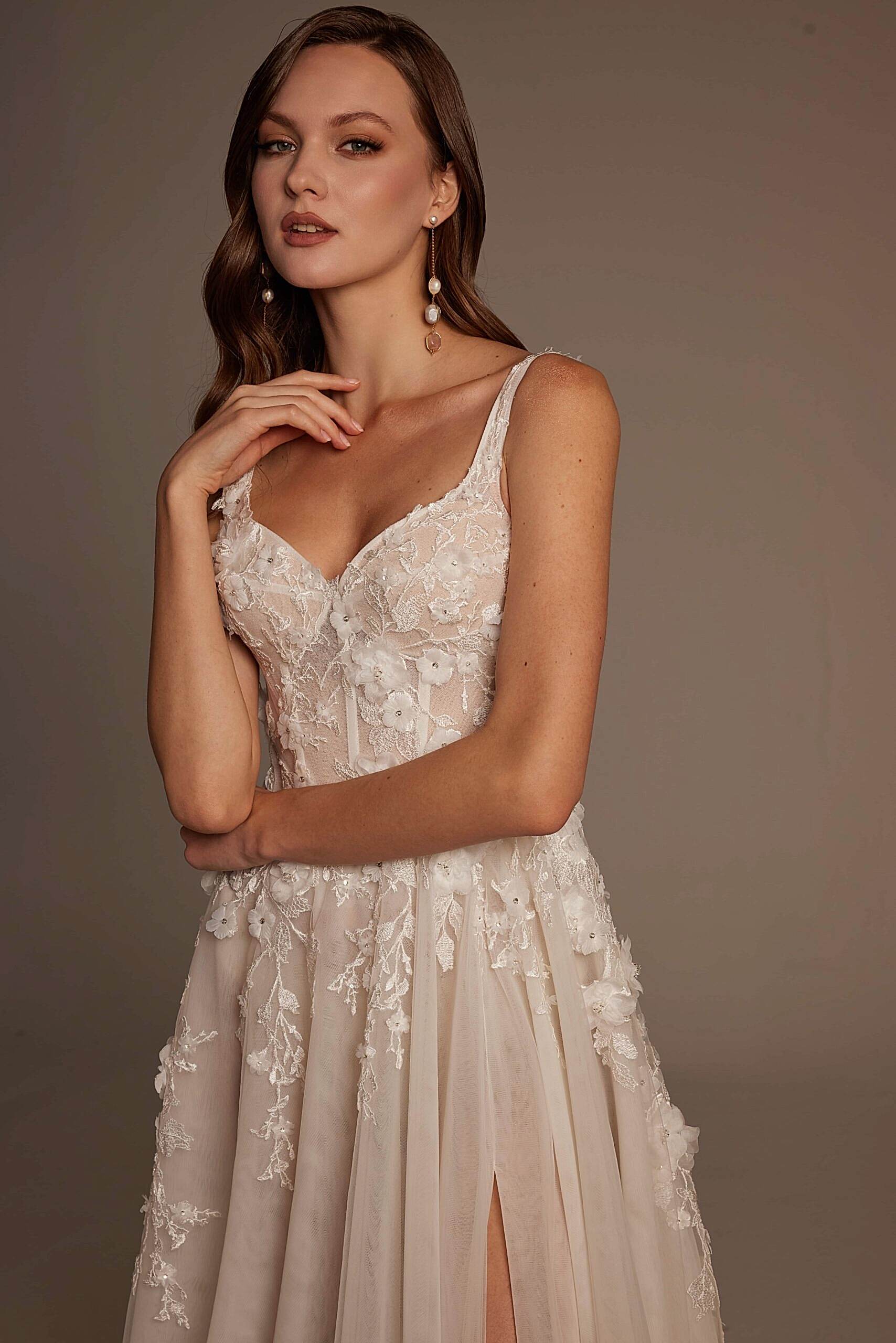 Roza Model, romantik detaylarla modern çizgileri bir araya getiren özel bir gelinlik tasarımıdır. İnce askılı ve transparan dokulu korsajı, vücudu zarif şekilde sararken el işçiliği dantel aplikeleri gelinliğe sofistike bir görünüm kazandırır. Derin yırtmaç detayıyla hareketlenen etek yapısı, hafif ve akışkan tül formuyla gün boyu konfor sunar. Arka görünümdeki zarif sırt kesimi ve doğal dökümlü etek, Roza Model’i hem sade hem iddialı bir tercih haline getirir.