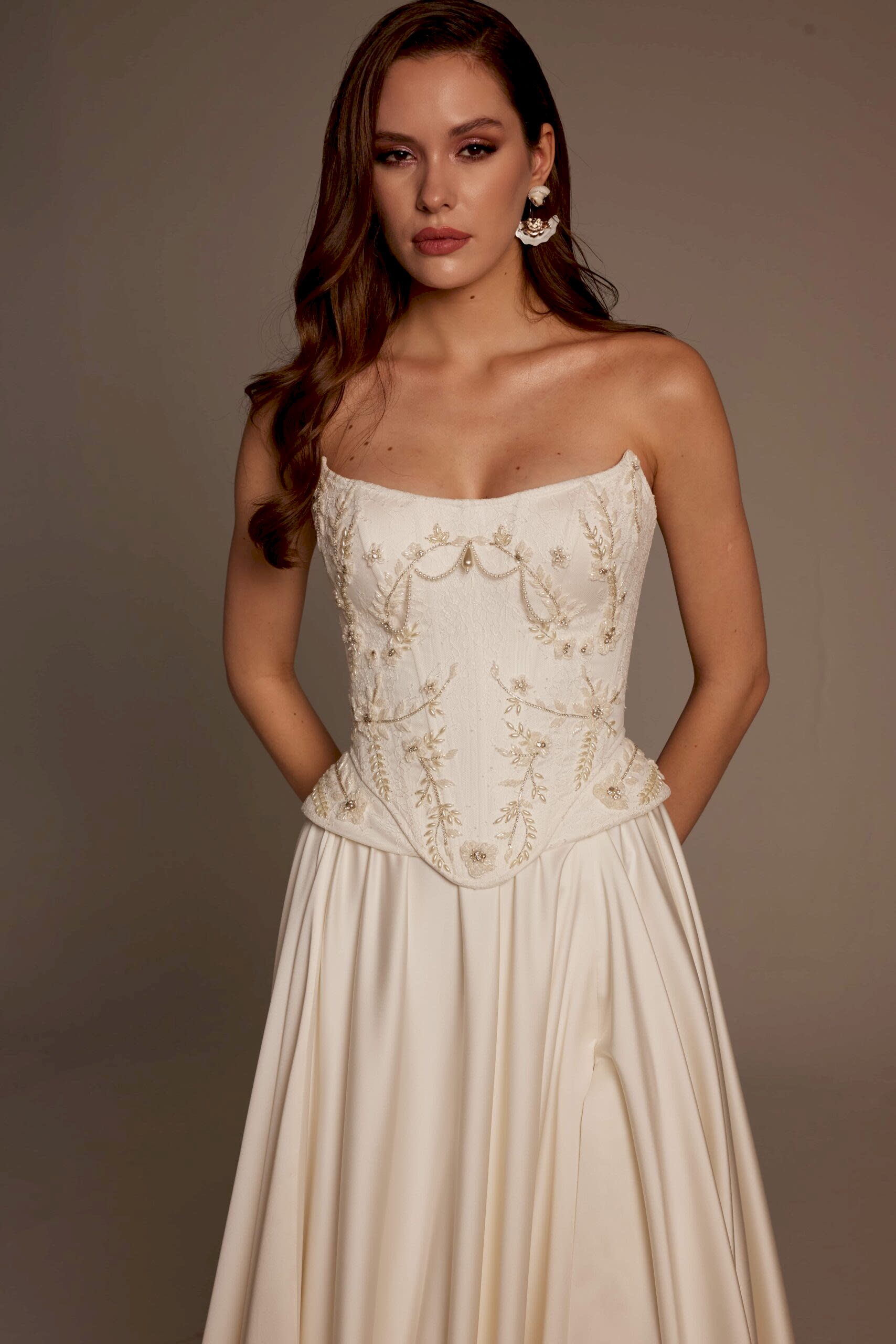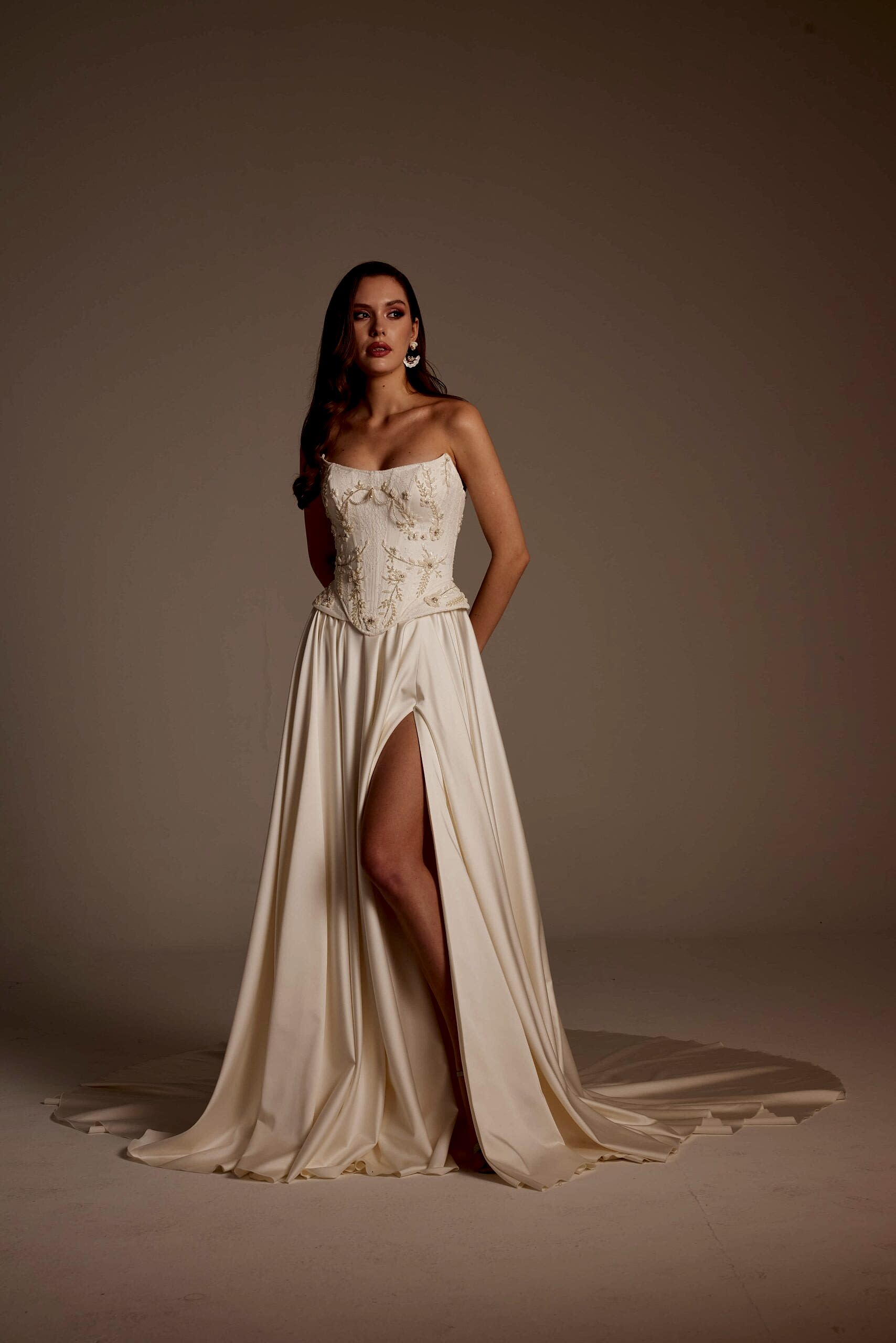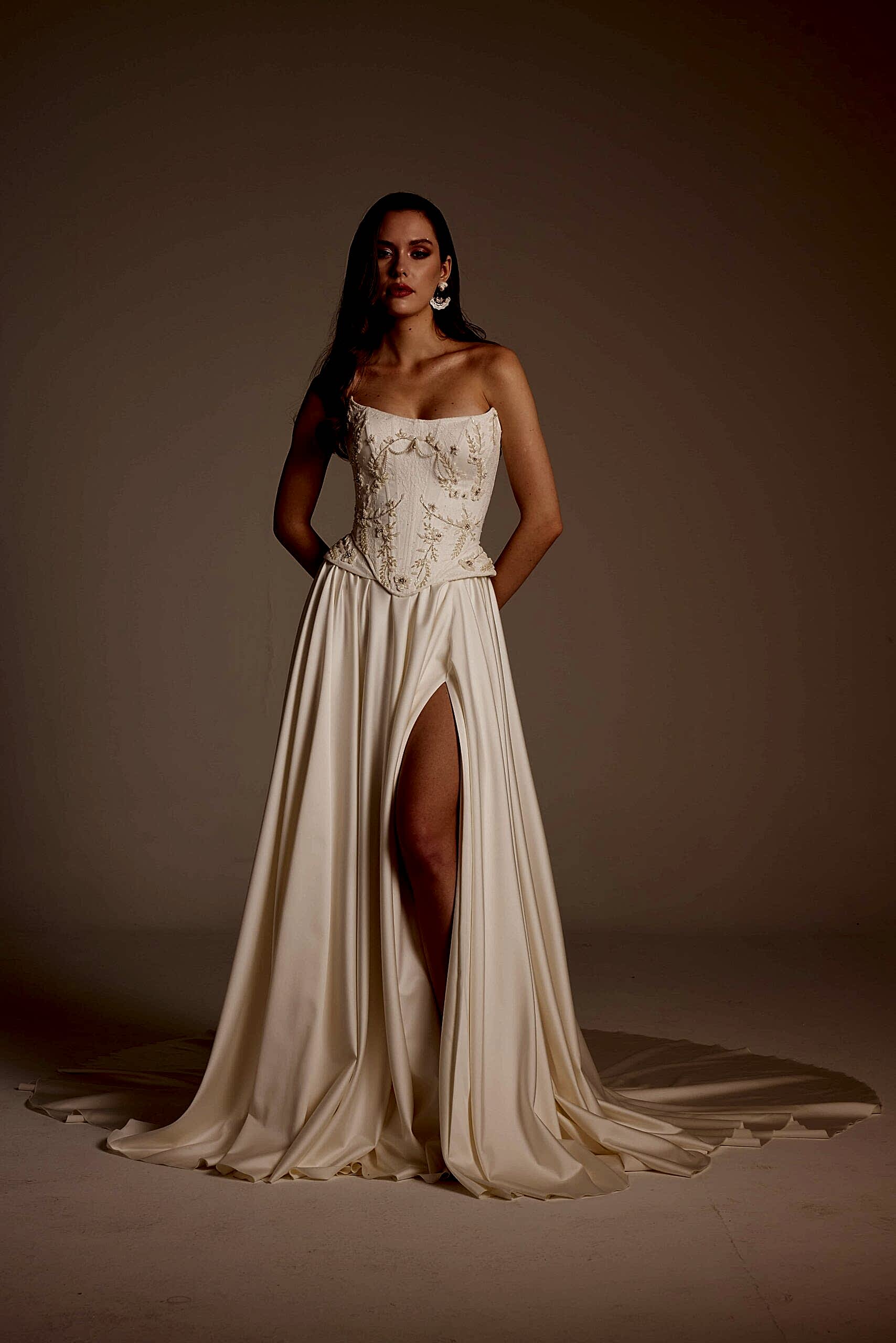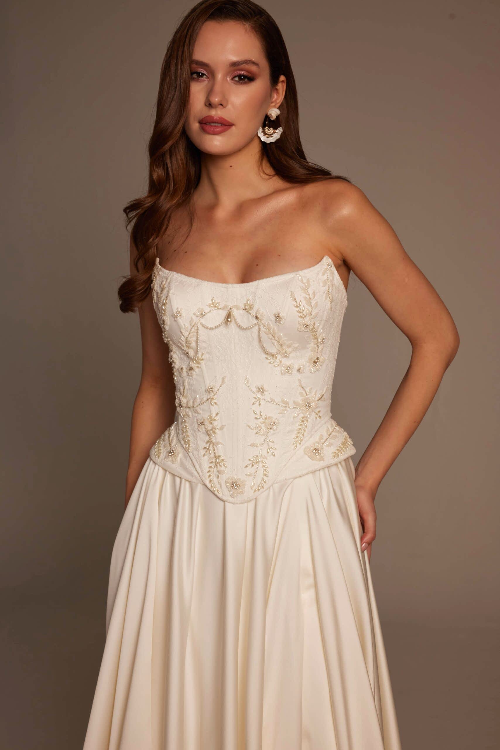 Korse formundaki üst beden, bel hattını net bir şekilde vurgulayarak feminen bir duruş sağlar. İşlemelerin doğal geçişleri, gelinliğin üst kısmında zarif bir hareket oluştururken eteğe doğru sadeleşen yapı, tasarıma dengeli ve modern bir görünüm kazandırır. Ön kısımda yer alan yırtmaç detayı ise Selin Model’i klasik gelinliklerden ayırarak cesur ve şehirli bir stil sunar.