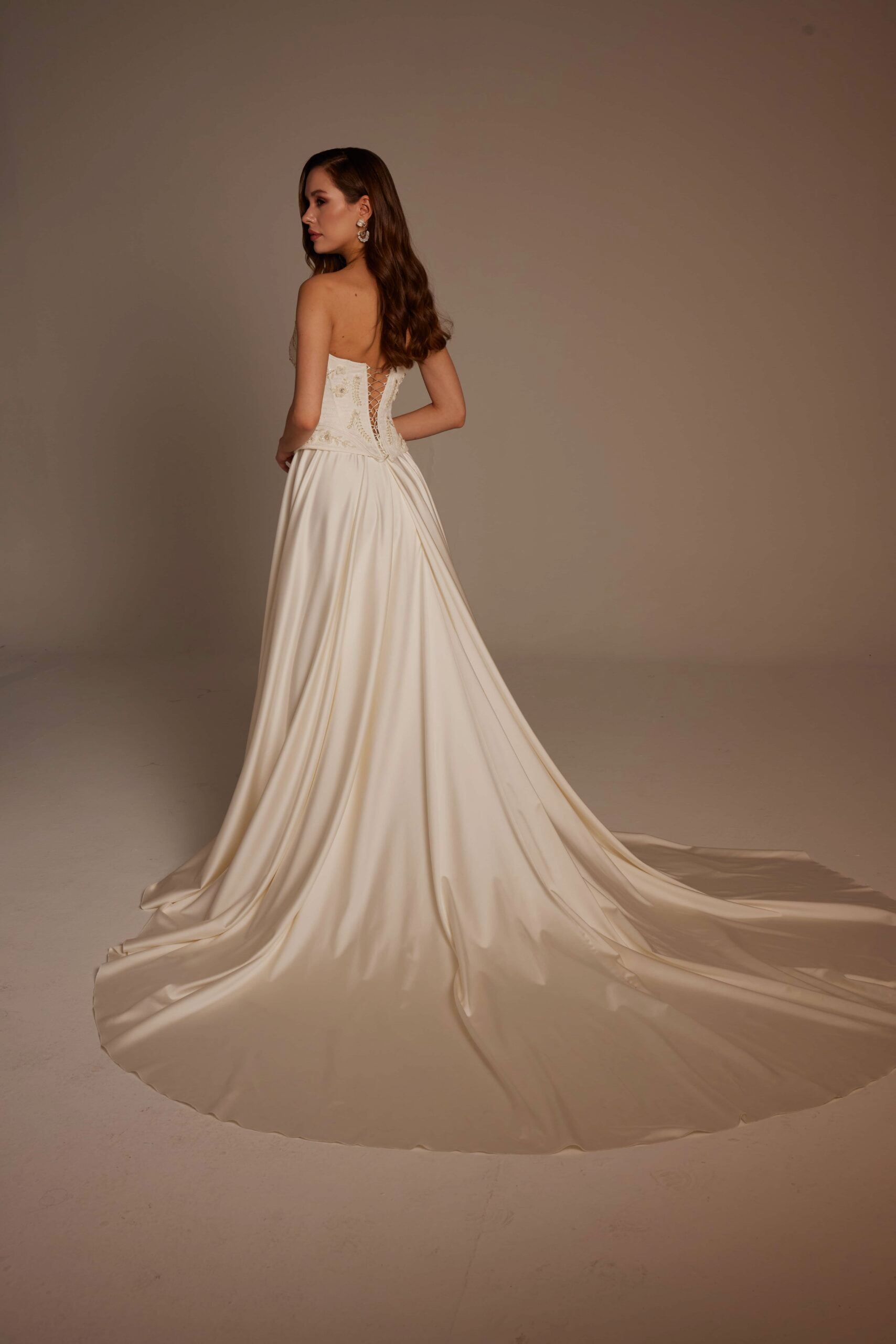 Arka tasarımda yer alan bağcıklı korsaj detayı, hem estetik hem de vücuda uyumlu bir yapı sağlar. Uzun ve akışkan etek, yürüyüş sırasında doğal bir hareket sunarak gelinliğin zarafetini ön plana çıkarır. Selin Model, rahatlığı ve şıklığı bir arada arayan gelinler için ideal bir seçenektir.