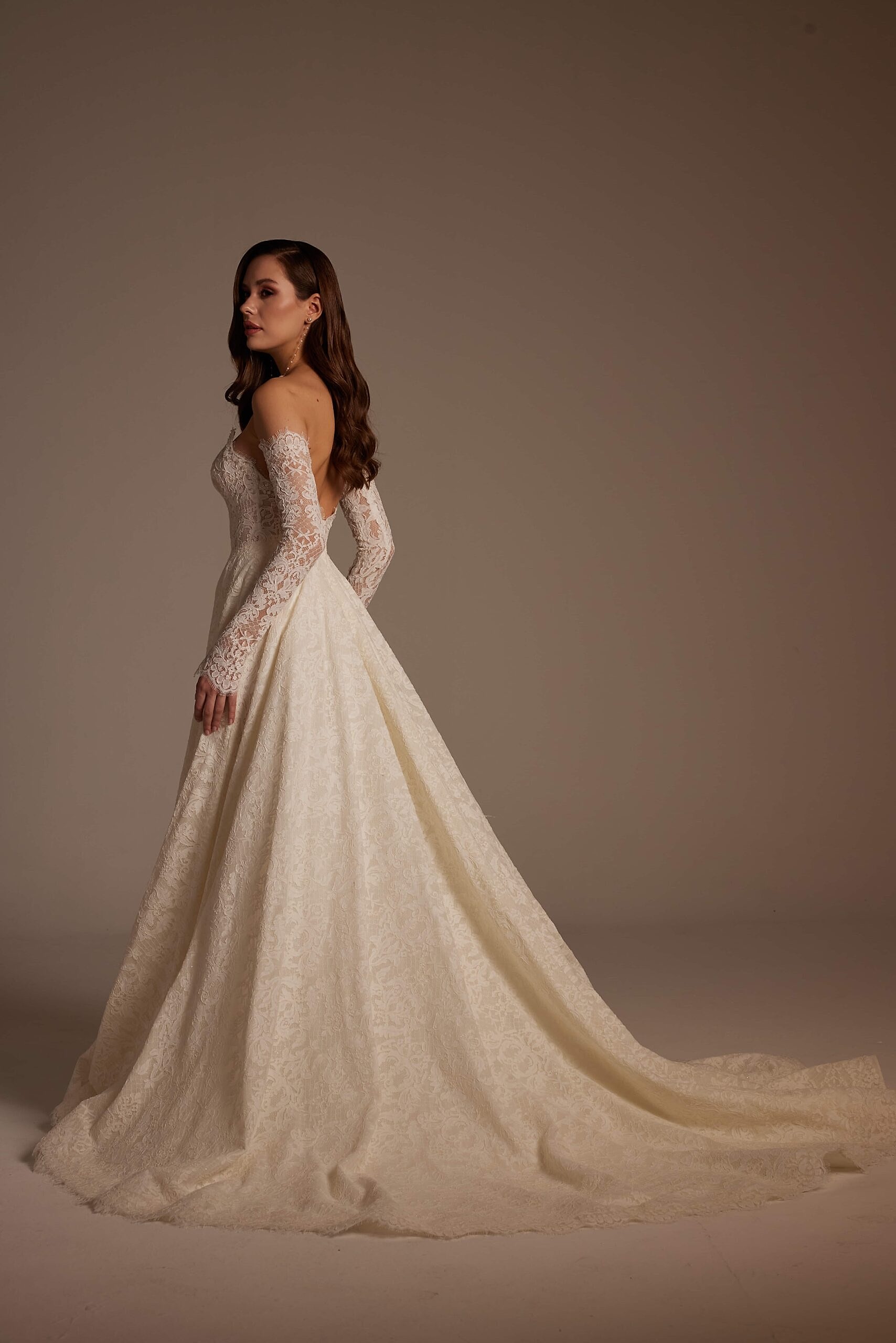 Arka tasarımda açık sırt formu ve zarif dantel geçişleri yer alır. Uzun ve akışkan etek yapısı, yürüyüş sırasında doğal bir hareket sağlarken gelinliğin asil duruşunu tamamlar. Vera Model, klasik gelinlik anlayışını modern detaylarla yeniden yorumlayan güçlü bir tasarımdır.
