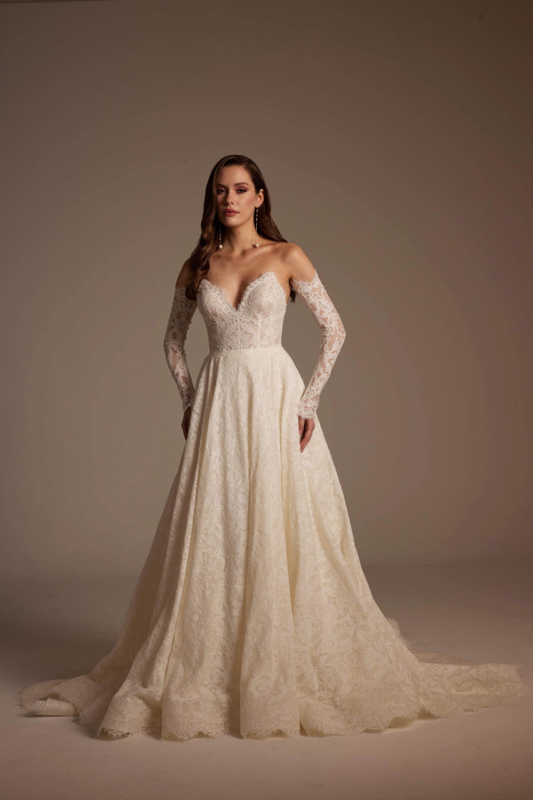 Vera Model, Nurcan Ege 2026 Gelinlik Koleksiyonu’nun zamansız dantel zarafetini güçlü ve feminen bir siluetle birleştiren özel tasarımlarından biridir. Omuzdan düşen dantel kollar ve derin V yaka formu, dekolte hattını zarif bir şekilde vurgularken gelinliğe romantik ve sofistike bir karakter kazandırır.
